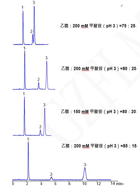 乙腈與緩沖鹽的比例,緩沖鹽的濃度可調整保留時間。