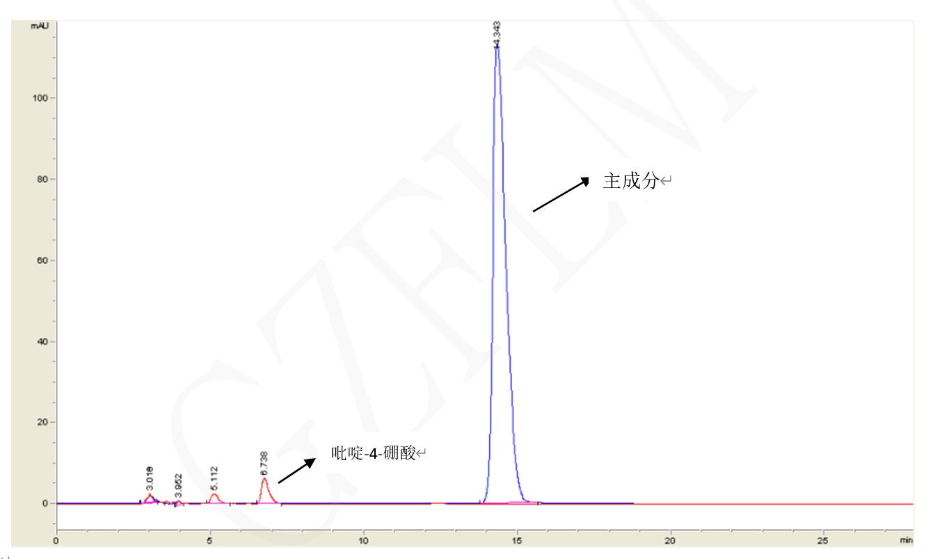 評(píng)價(jià):增強(qiáng)了吡啶-4-硼酸的保留,吡啶-4-硼酸在 C18 下沒(méi)有保留,且吡啶-4-硼酸與主成分不能分離。