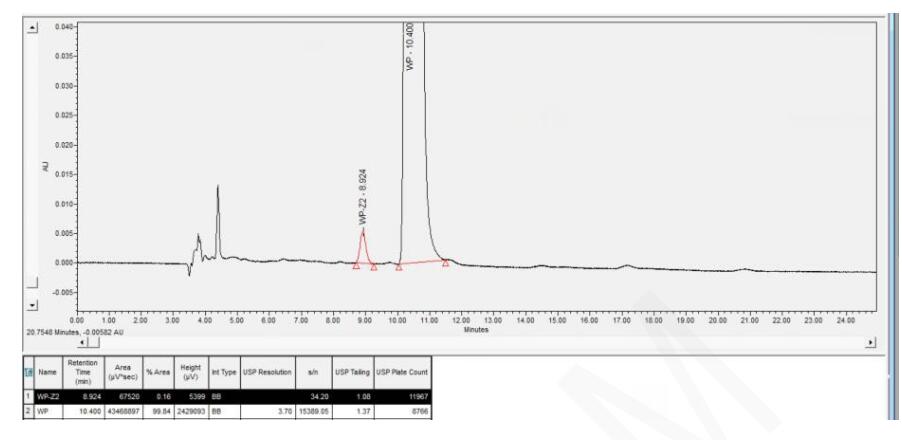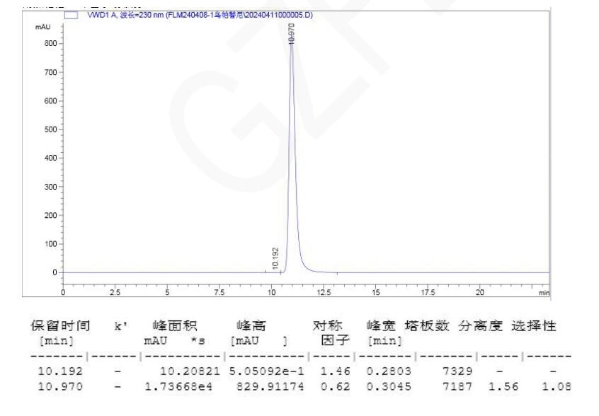 因此,為了確保烏帕替尼手性拆分的準(zhǔn)確性和有效性,建議在專業(yè)的實(shí)驗(yàn)室或藥物研發(fā)機(jī)構(gòu)進(jìn)行,并由具有相關(guān)經(jīng)驗(yàn)和技能的專業(yè)人員操作。這樣不僅可以確保拆分過程的順利進(jìn)行,還可以保證拆分后得到的對(duì)映體的純度和活性滿足藥物研發(fā)和生產(chǎn)的需要。 App ID: FLM-B240004 烏帕替尼手性拆分 色譜柱:Chiral MZ(2)-RH 3μ 250*4.6mm (貨號(hào):FMG-AC3-B02-R) 流動(dòng)相:反相 (詳詢銷售代表) 流速:0.8 mL/min 檢測(cè)波長(zhǎng):230nm 柱溫:30℃ 樣品濃度:0.5mg/mL (異構(gòu)體含量約 0.1%以下和異構(gòu)體含量 0.15%) 稀釋劑(乙腈:水-30:70) 進(jìn)樣量:10ul 色譜圖 1:(低于 0.1%限度)