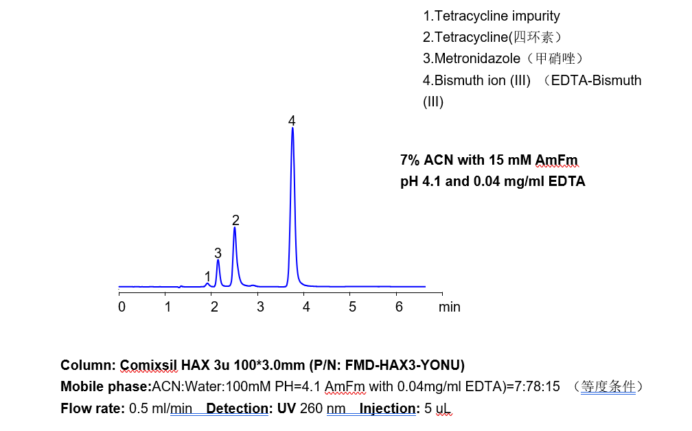 說明:在以上“方法A”中,絡(luò)合三價鐵離子的過程是在鐵離子接觸到流動相時瞬時進行的,從而絡(luò)合物在HAX色譜柱上保留,并通過UV可視從而檢測。在“方法B”中,案例的實際樣品是硫酸亞鐵,但是亞鐵的二價離子,在固體鹽溶解時,水中電離出的游離亞鐵離子,即氧化成三價鐵離子,實際檢測到的也是三價鐵離子的EDTA絡(luò)合物,而這個與“方法A”不同的地方在于,客戶不喜歡流動相中加EDTA,所以是在樣品配置過程中,加入了EDTA,使樣品在進樣前已經(jīng)絡(luò)合完畢。“方法A"中是梯度條件,”方法B“中是等度條件。單純的檢測,都可以用等度的方法進行,更方便。 兩種方法都可以用于單獨檢測三價鐵離子或者二價鐵離子。在此,需認(rèn)識到,二價鐵離子無法與三價鐵離子分離的,因為二價鐵離子實際就是氧化后的三價鐵離子。所以,關(guān)于能否分離二價與三價鐵離子的問題討論,在這個方法中,是不存在的。 應(yīng)用二:三價鉍離子的檢測 在前文三價鐵離子的基礎(chǔ)上。我們開發(fā)出三價金屬離子HPLC-UV檢測辦法。實際應(yīng)用中,遇到了三價鉍離子的殘留檢測的問題。按照同樣的思路,以下案例以EDTA與三價鉍離子絡(luò)合物狀態(tài),一樣得以相似方法檢測。