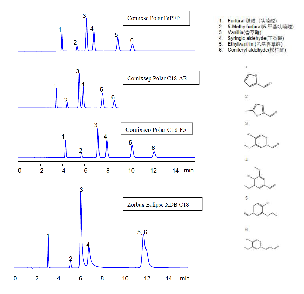 Comixsep 分析六種結(jié)構(gòu)相似醛的選擇性對(duì)比 App ID: FLM-220031 色譜柱:Comixsep Polar C18-AR, C18-F5, BiPFP(規(guī)格4.6*150 mm, 3 um) 方法: 水:乙腈:200mM 磷酸二氫銨:1%磷酸=45:20:25:10 流速:1 mL/min 檢測(cè)波長(zhǎng):225nm ![]() |