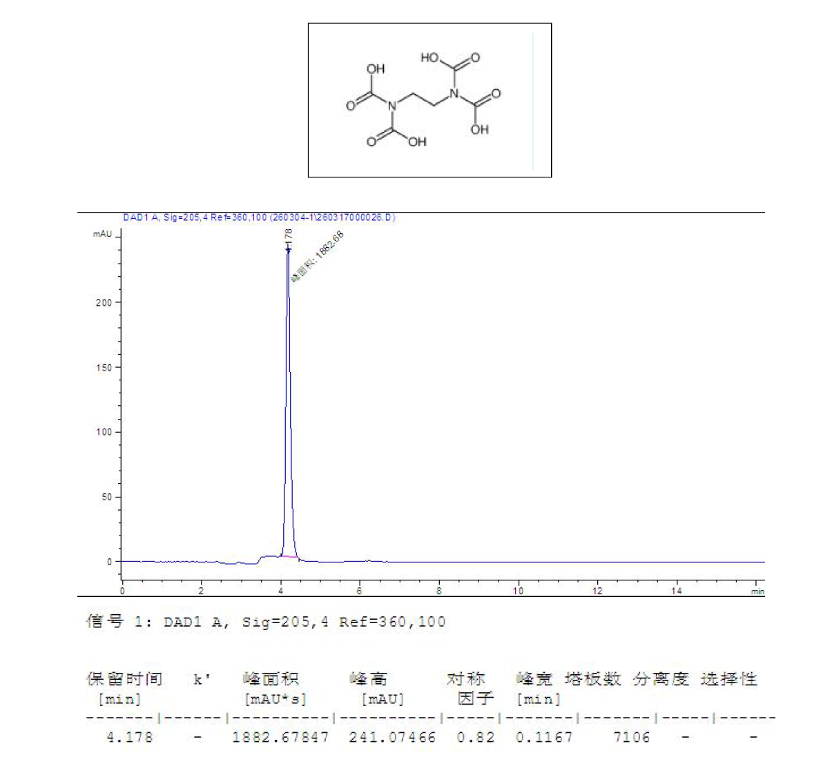 App ID: FLM-T260001 Titank C18 柱對EDTA 的檢測 方法:自定 色譜柱:Titank C18 5μ 250×4.6mm 貨號:FMG-5560-EONU 流速:1 mL/min 檢測:UV205nm 樣品濃度:1 mg/mL,溶劑:水,進樣量:2 μ 流動相:0.1%磷酸水溶液 色譜圖: 說明:EDTA 作為藥物輔料中常見成分,Titank C18 雜化硅膠固定相,可在純水相條件下實現快速分析, 柱效良好。 ![]() |