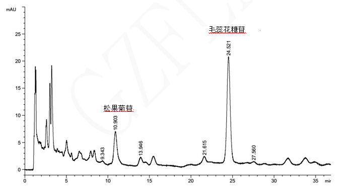 注:藥典規(guī)定松果菊苷理論塔板數(shù)應(yīng)不低于3000,本結(jié)果松果菊苷理論塔板數(shù)為:3825